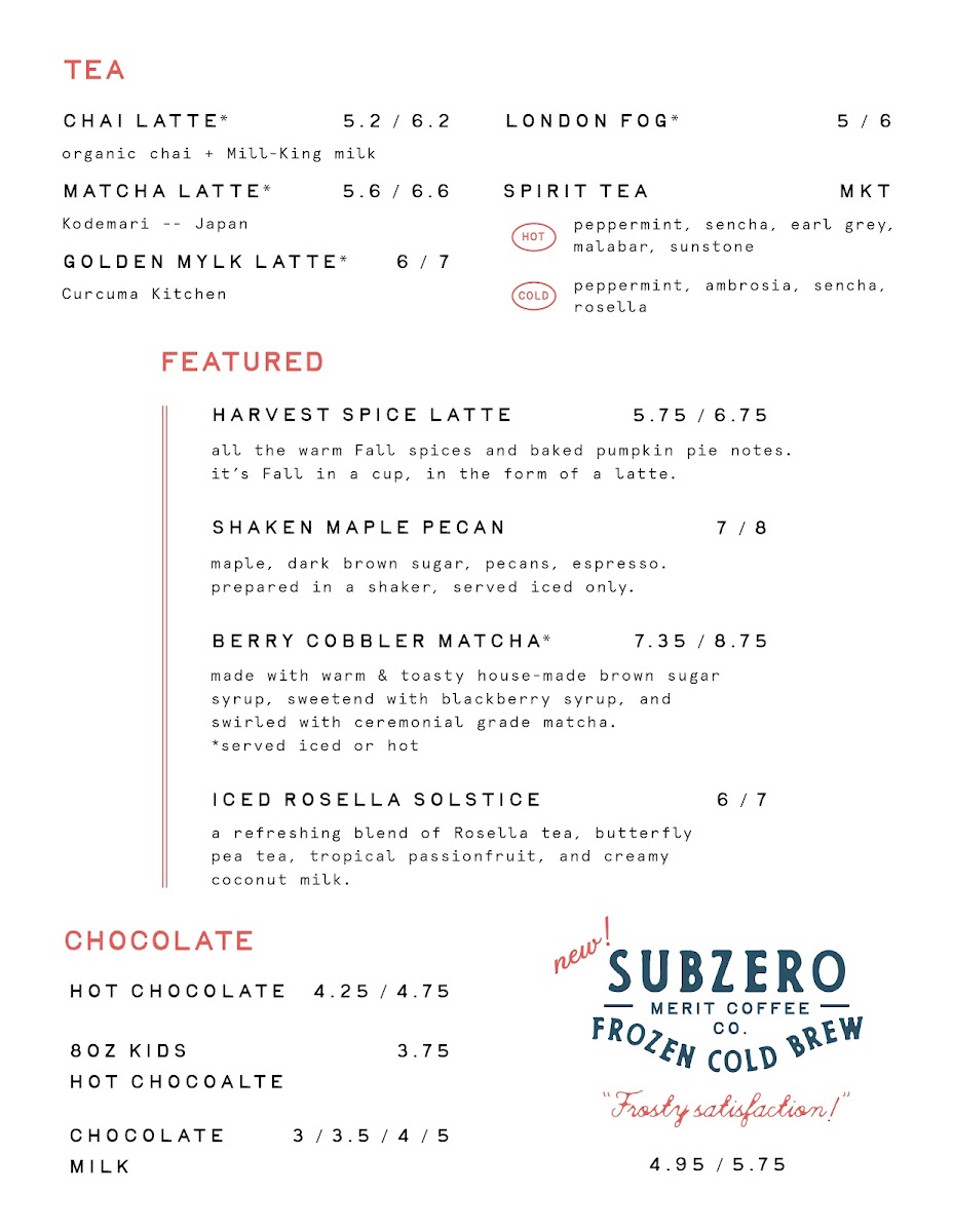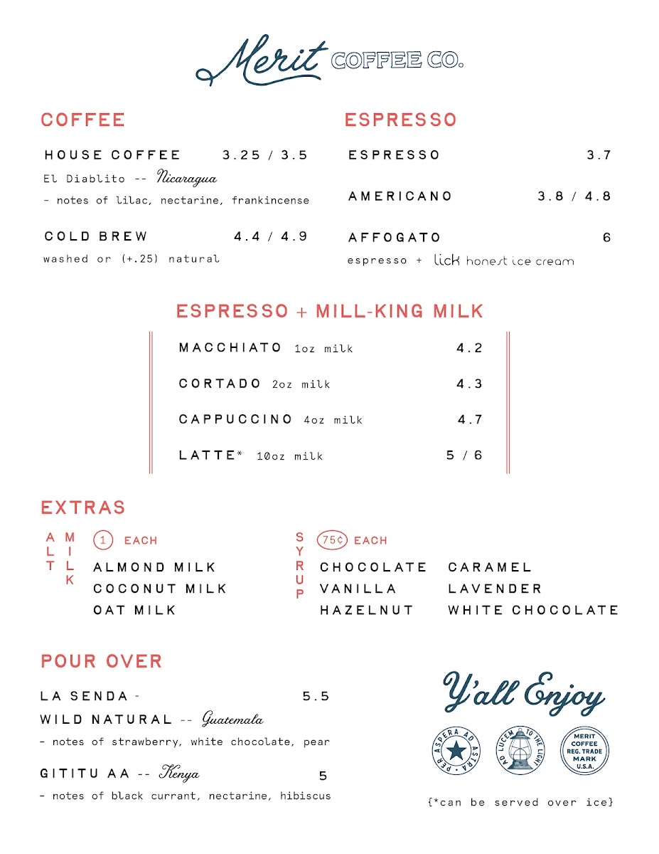 Upon entering Merit Coffee Co., you’re greeted by a vibrant space buzzing with energy. The café is especially bustling during peak hours, but don’t let the line deter you—it moves quickly, allowing you to savor the anticipation of your drink. With a mix of cozy indoor seating and ample outdoor tables, it’s the perfect spot for a catch-up with friends or a productive work session. The ambiance is bright, enhanced by a friendly staff eager to help you navigate their enticing menu.